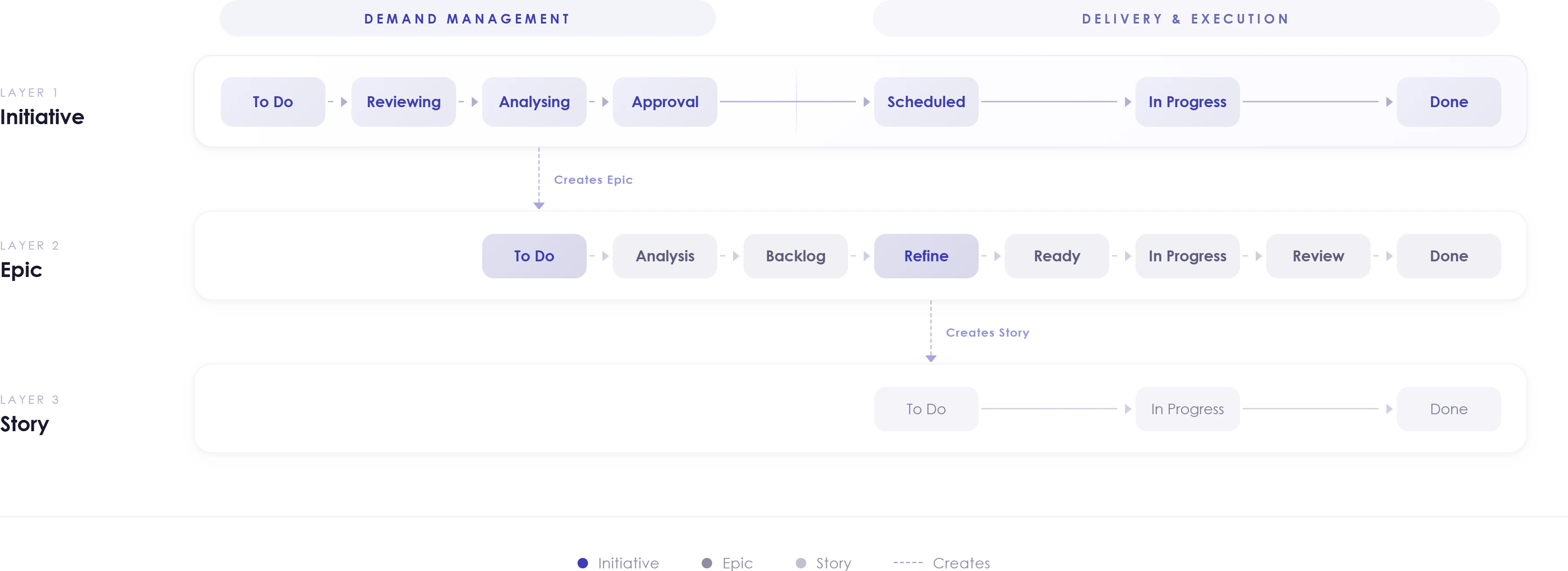 One of the big advantages of adopting “Model 2” for your Jira project set up (see above) is that it makes it much easier to manage a common initiative workflow. This typically encourages (and sometimes requires) related work further down the issue heirarchy (for your value streams/products/business units) to follow a standardized workflow for their epics.