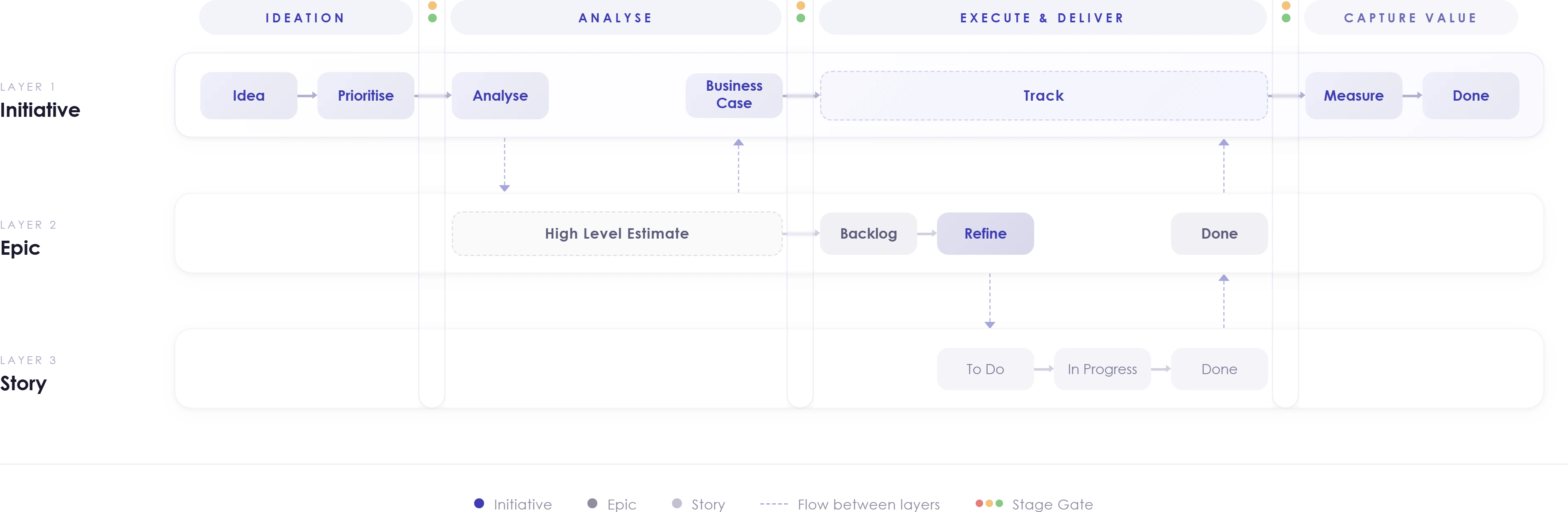 This approach allows your organization to retain significant, multi-stage control over the high level capital allocation process while devolving responsibility and accountability for delivery of initiatives down to value streams, business units and teams.