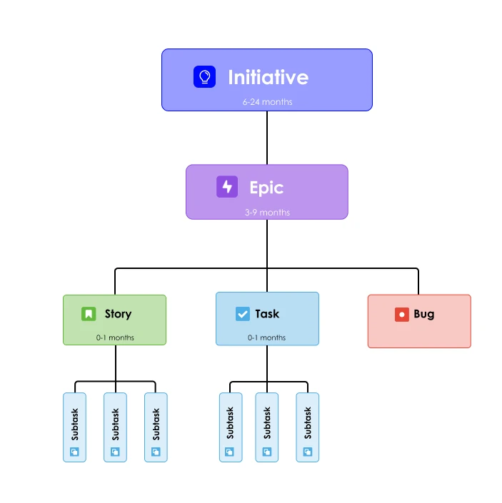 We recommend keeping things simple. Most organizations will thrive with a 4 layer issue hierarchy, as per the diagram below. It’s the perfect balance between simplicity and sophistication. Remember that every time you add a new layer of the hierarchy, you open the door to exponential complexity further down the line. Take note that the branched nature of a work hierarchy means that we mean literal, mathematical exponential complexity, not metaphorical.