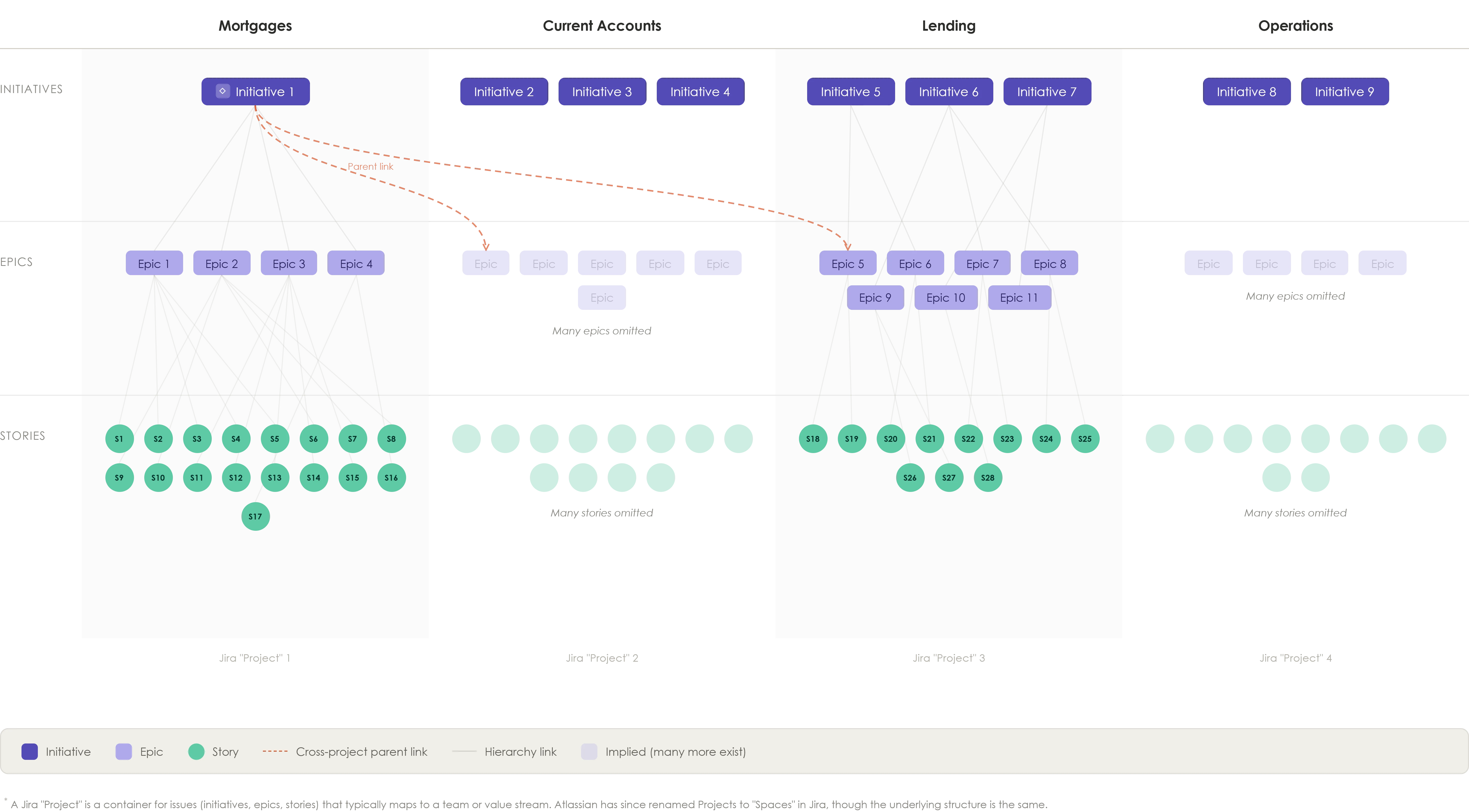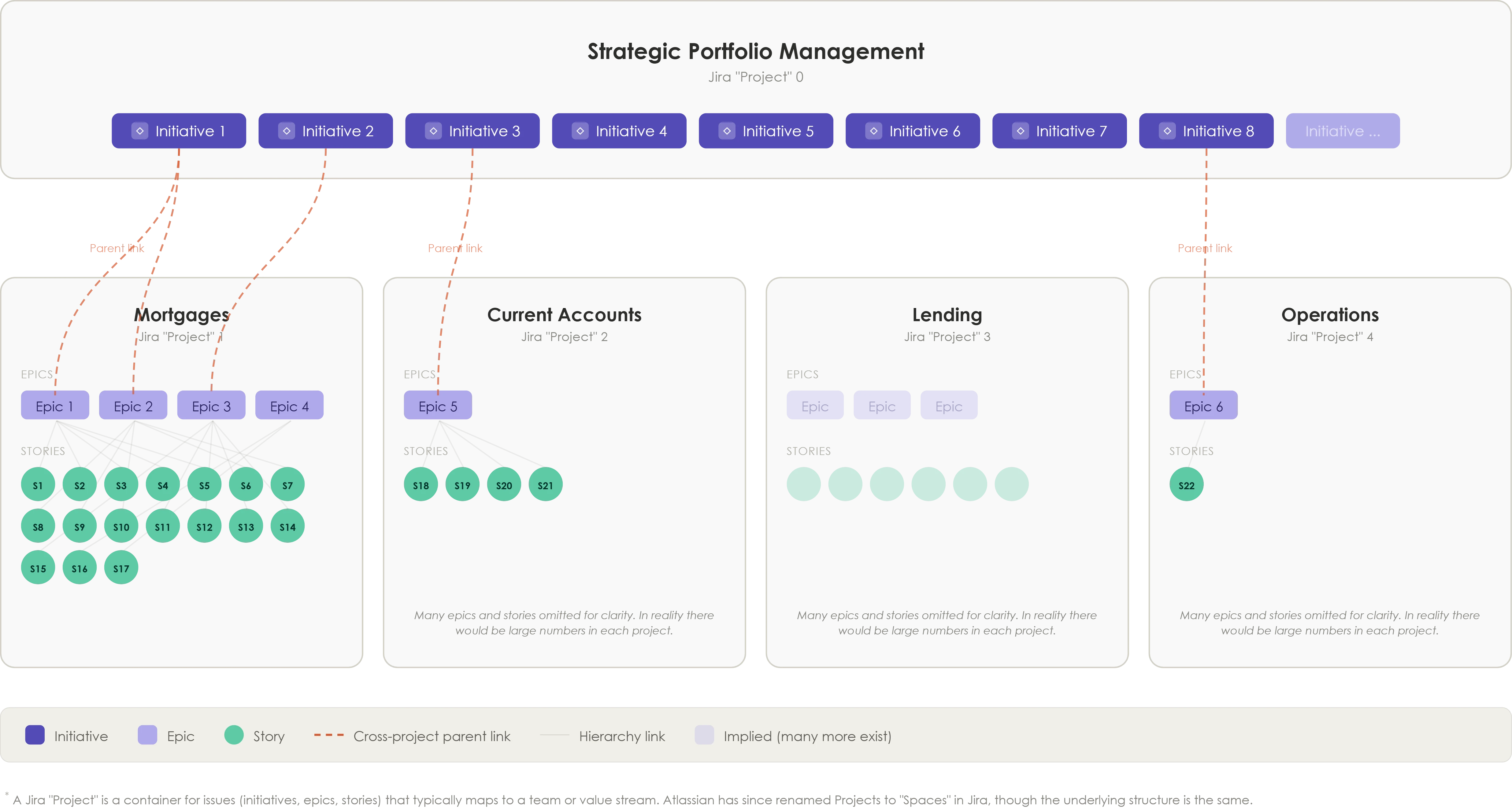 In this model, a Jira project exists for each value stream (or product or business unit). Each Jira project owns its own initiatives. Under each Initiative, we see the issue children (epics and stories).