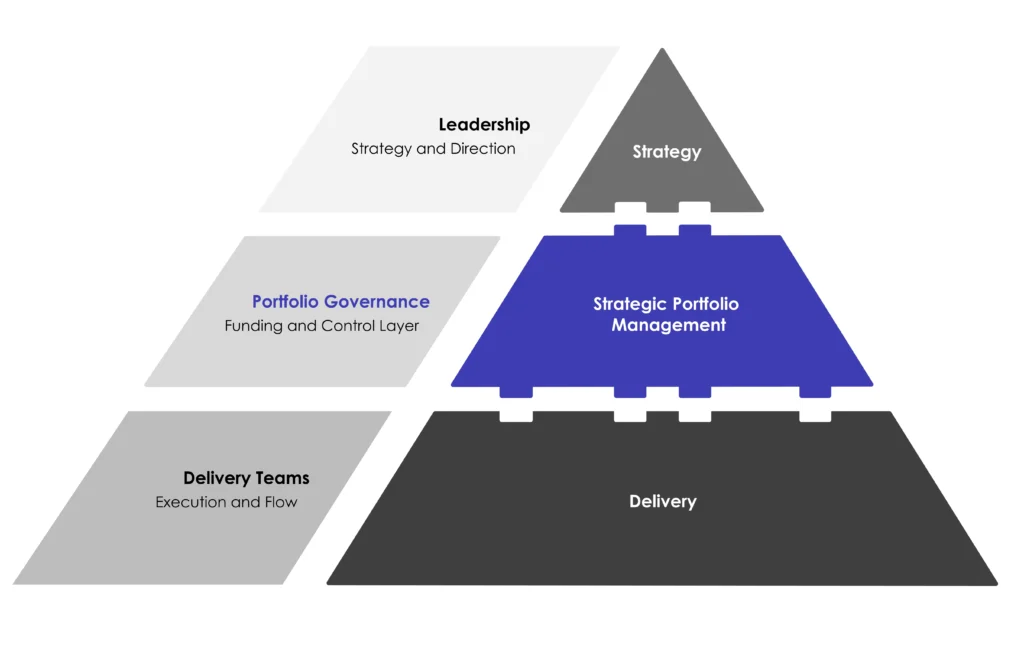 Strategic portfolio management operates between strategy and delivery, translating strategic intent into governed portfolio decisions and funded execution.
