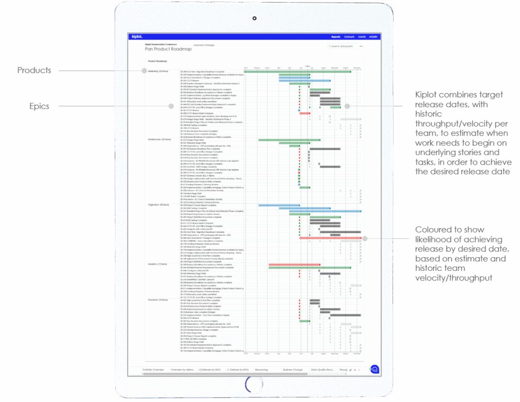 You can also use Kiplot to overlay delivery analytics onto your roadmap to tell you how the team is doing.