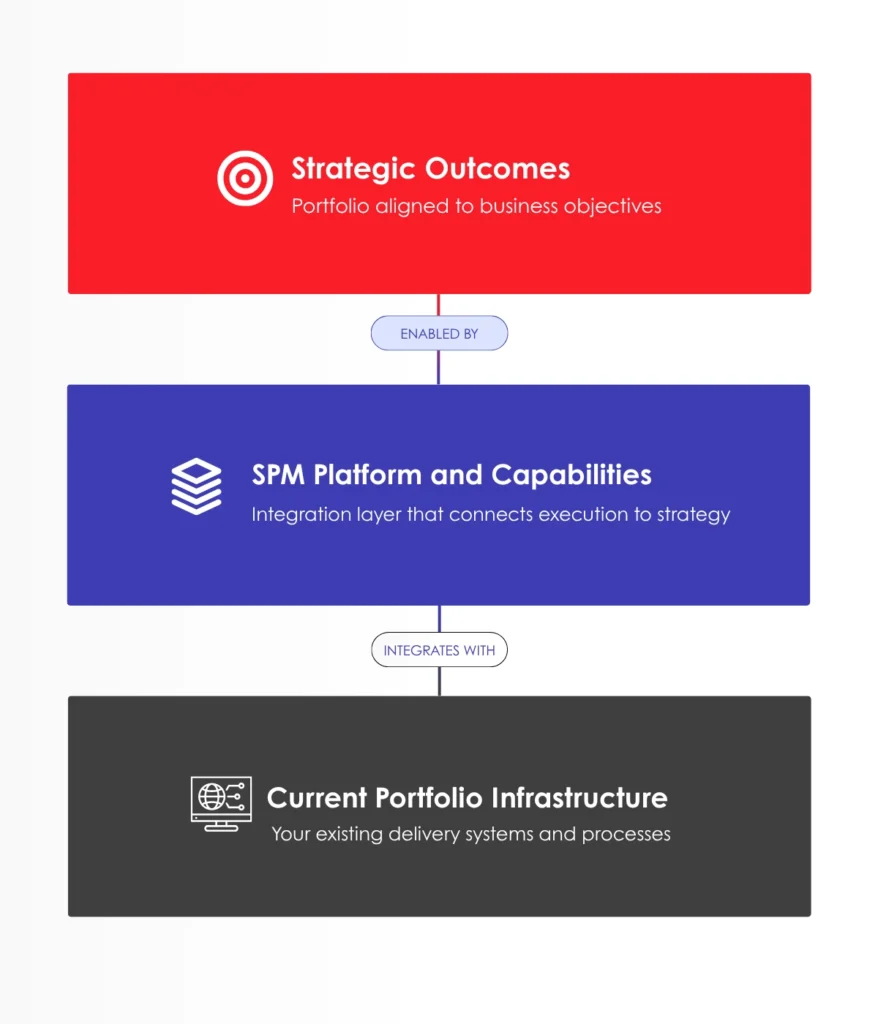 💡 SPM provides a holistic, strategy-to-execution model that works across projects, agile initiatives, and hybrid approaches – aligning all investments and resources to business outcomes, not delivery methods.